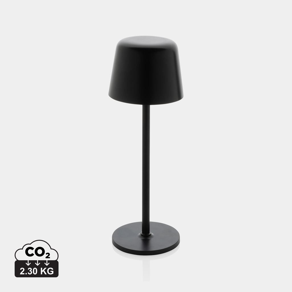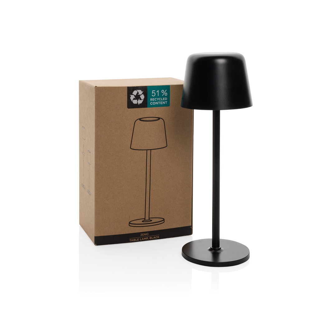 - Lámpara de mesa Zenic RCS plástico reciclado recargable USB, color: negro (Ref. P513.9701). Moderna lámpara de mesa recargable y portátil que quedará bien tanto en tu escritorio como en tu salón. Fabricado con ABS reciclado certificado RCS y poste metálico. Contenido reciclado total: 51% basado en el peso total del artículo. La certificación RCS garantiza una cadena de suministro de materiales reciclados completamente certificada. La lámpara de mesa funcionará hasta 8 horas con una sola carga y se puede recargar en 3 horas. Con batería integrada de grado A de 1200 mah, con tres modos (luz cálida, luz blanca y neutra) que se pueden ajustar tocando la parte superior de la lámpara. Recargable mediante USB-C que incluye cable de carga de TPE reciclado de 80 cm. Presentado en envases mixtos FSC®. Sin PVC. También en colores blanco, bronce y plata.