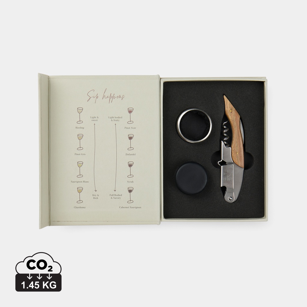 - Historia del vino VINGA, color: blanquecino (Ref. V2630013). Embárcate en un sofisticado viaje con el set Story of Wine, elegantemente empaquetado en una caja de regalo que se asemeja a un libro clásico. Este set incluye un sacacorchos, una tapa de silicona para mantener el vino fresco por más tiempo y un tapón antigoteo para servir sin goteo. El exclusivo estuche no solo protege tus herramientas, sino que también cuenta una cautivadora historia del vino, lo que lo convierte en un regalo perfecto para los entusiastas de esta bebida. La caja de regalo está hecha de papel con certificación FSC®.