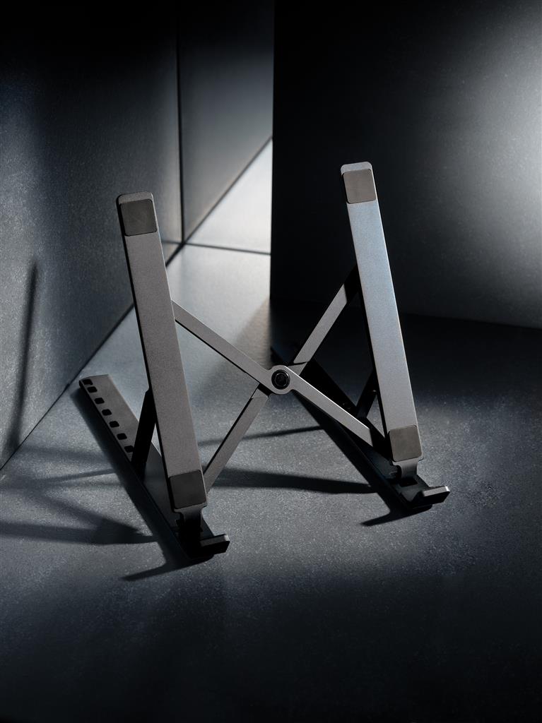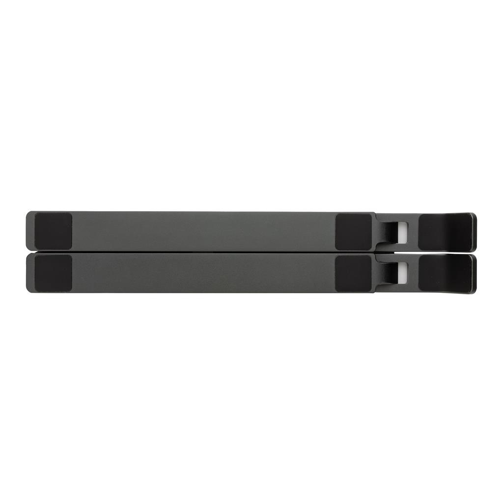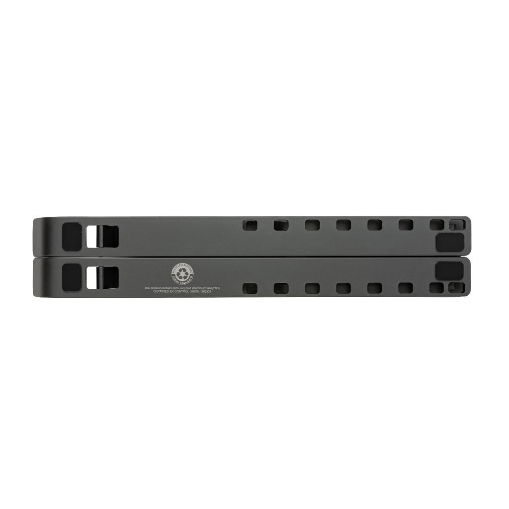 Soporte de aluminio para portátil fabricado con aluminio reciclado certificado RCS (Recycled Claim Standard) y TPU. Contenido reciclado total: 99% basado en el peso total del artículo. La certificación RCS garantiza una cadena de suministro completamente certificada de los materiales reciclados. El soporte es plegable y puede albergar cualquier portátil de hasta 15,6″. El soporte se puede ajustar en 8 ángulos diferentes para lograr una postura ergonómica óptima cuando se trabaja con el ordenador portátil. El aluminio no pierde sus características en el proceso de reciclaje y puede reciclarse infinitamente. Compatible con las tablets y portátiles más comunes. Con tiras de TPU reciclado certificado por RCS en la parte inferior para evitar resbalones. Presentadoo en embalaje mixto FSC®.